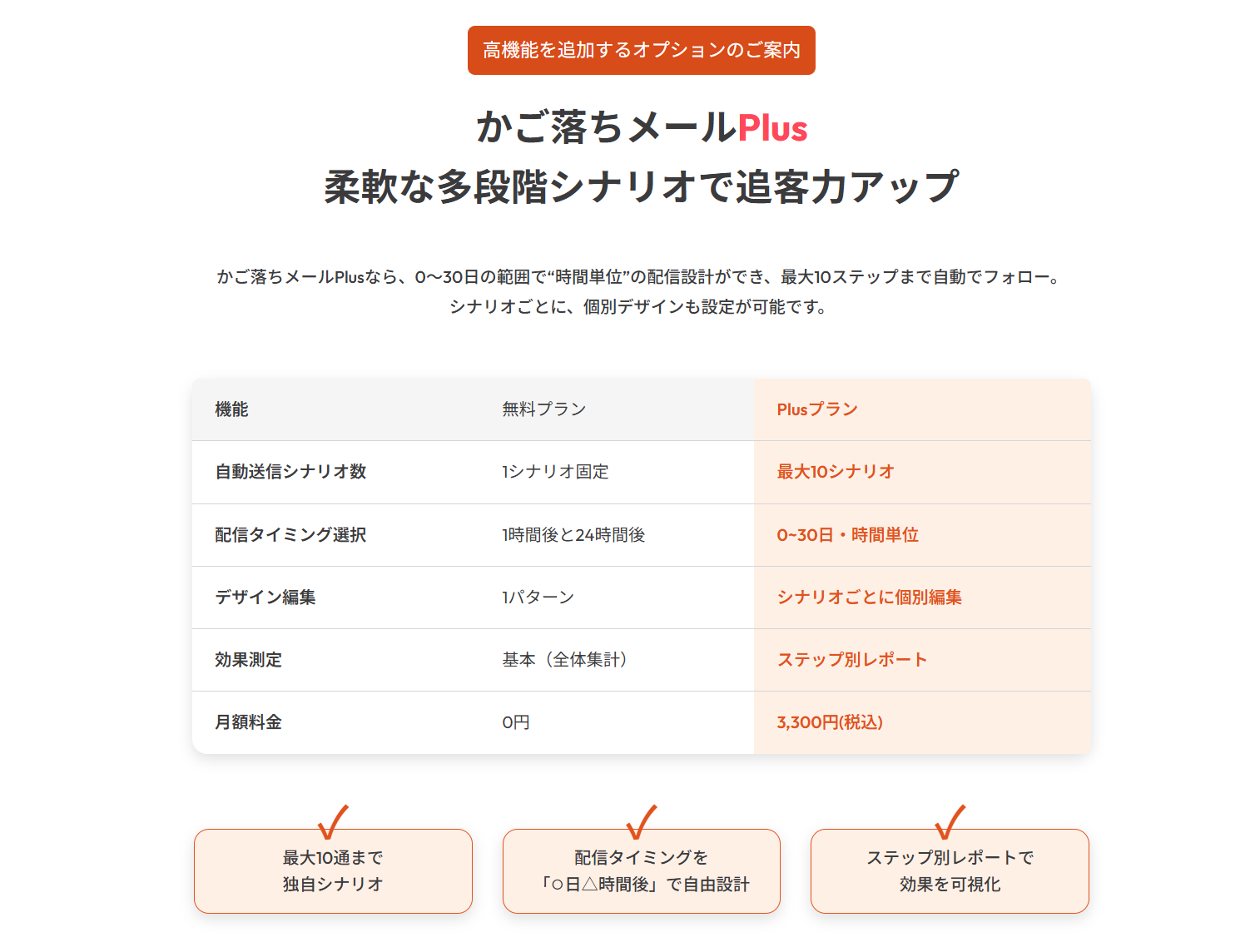 かご落ちメールPlusオプションは、makeshopのユーザー様にご提供する、MakeRepeaterのオプション機能です。※月額3,300円(税込)