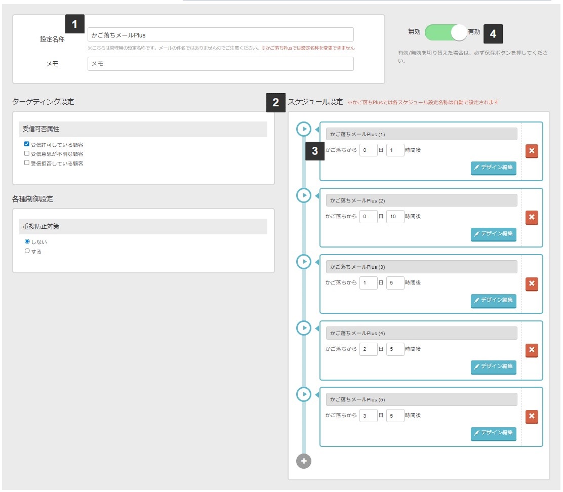 設定名称 | 任意で編集可能 | 「かご落ちメールPlus」で固定 | 新規登録顧客への配信 | 即時配信対象とはならず1通目は配信なし、24時間後に購入がない場合に配信対象に | 登録から24時間以上経過後に配信対象に(24時間未満のスケジュールは配信なし) | 配信制御 | 深夜時間帯:23:00〜7:00の間に配信時間がかかる場合は保留となり、7:00以降に順次配信 | 深夜時間帯:23:00〜7:00の間に配信時間がかかる場合は、該当メールは配信されずスキップ ※ |