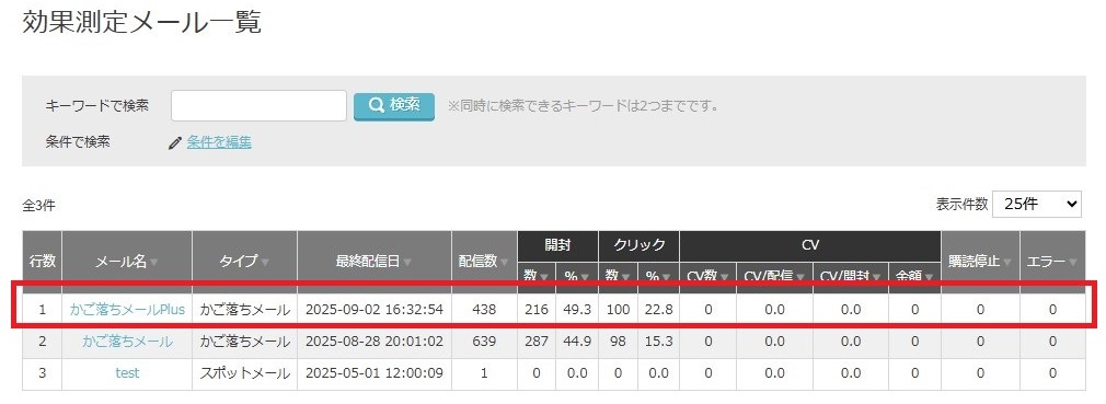 左メニュー:メール効果測定をクリックで、メール設定単位での結果一覧が表示されます。