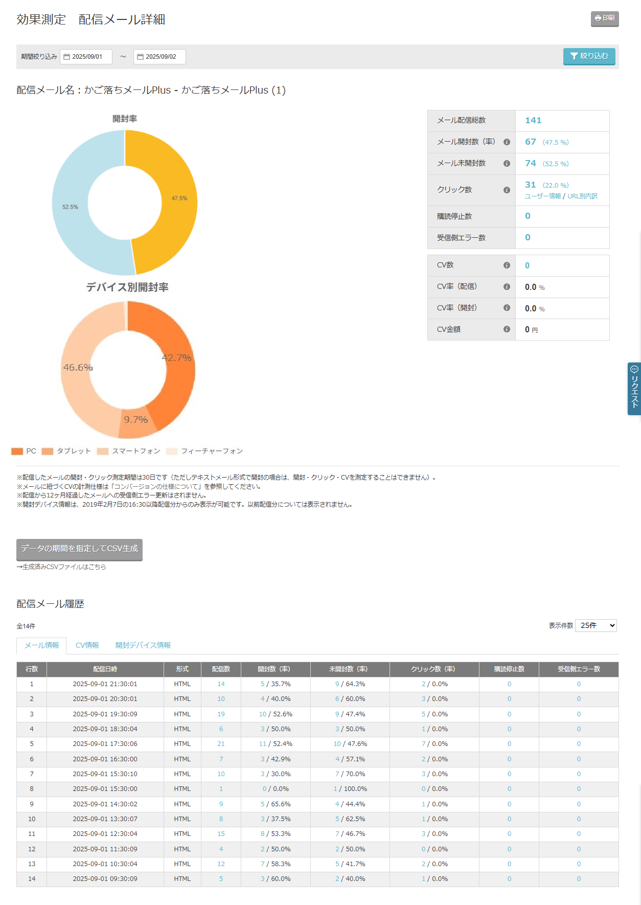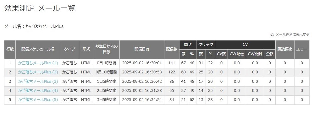 標準機能かご落ちメールの効果測定とは別に、「かご落ちメールPlus」単体の効果測定として表示されます。